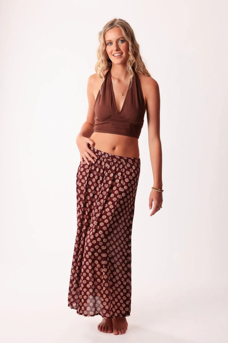 Step into timeless style with our Vonnie Skirt. This maxi skirt features a flattering flat front and elasticated back for comfort, set on a rich burgundy base adorned with a retro floral print. Coconut buttons down the front add subtle detailing, making it a versatile piece perfect for casual outings, layering or pairing with your favourite tops for a vintage-inspired look.