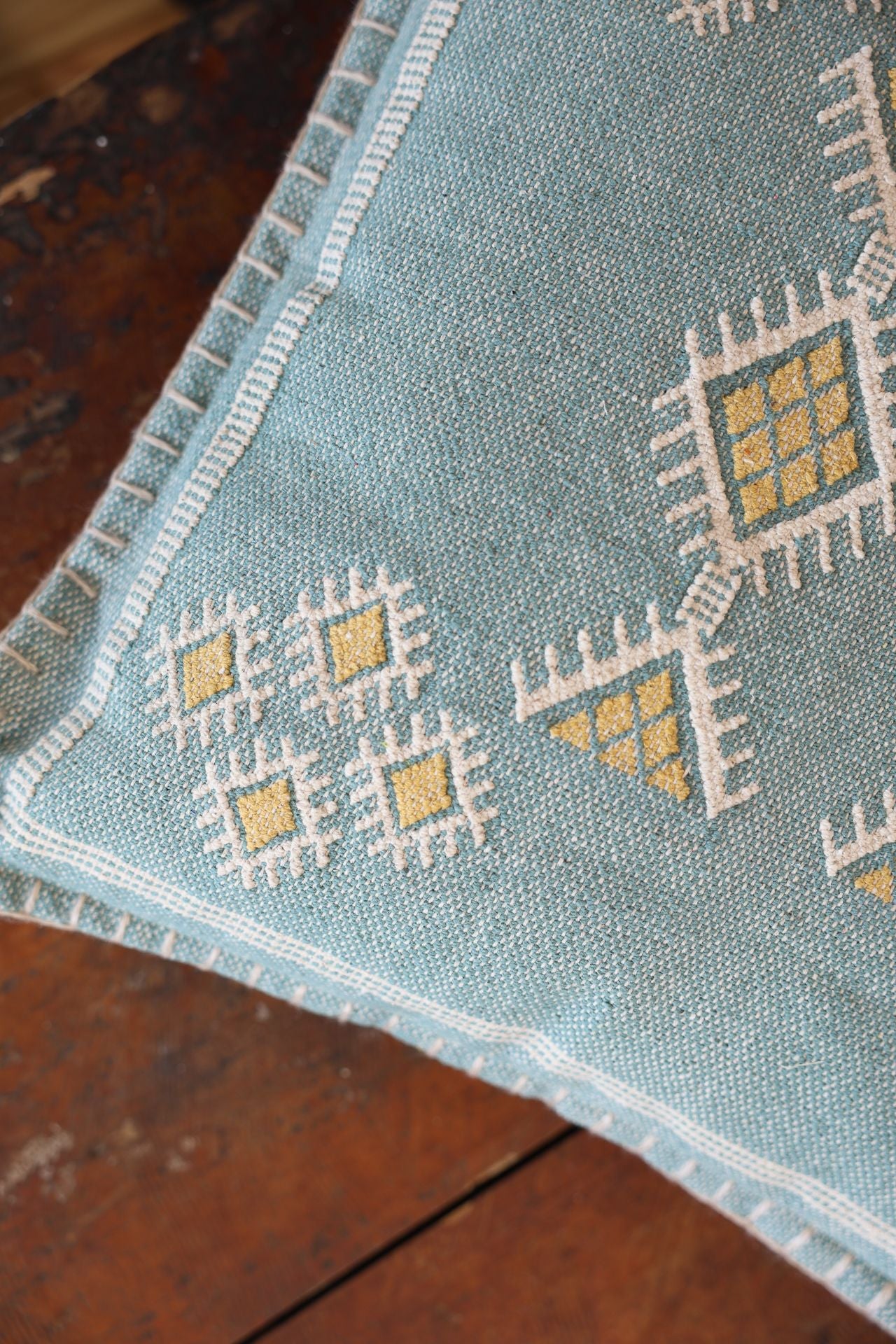 Bring global charm and bohemian elegance to your space with this Moroccan-inspired cotton cushion, featuring a muted blue base adorned with intricate yellow and white embroidery. The handcrafted detailing adds artisanal texture, making it a standout decorative piece for any room.