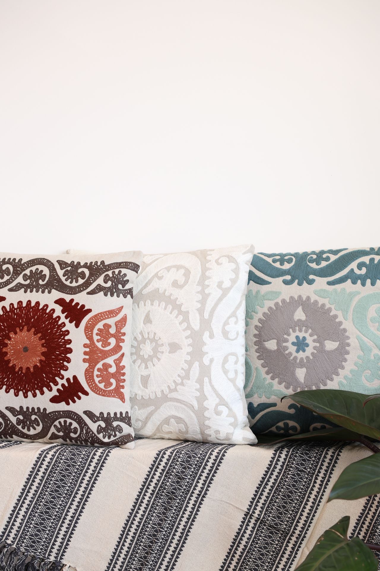 Add subtle elegance to your space with our cotton cushion, featuring a natural base adorned with intricate embroidery in soothing blues and soft greys. The detailed pattern adds texture and artisanal charm, while the soft cotton fabric ensures comfort and timeless bohemian style.