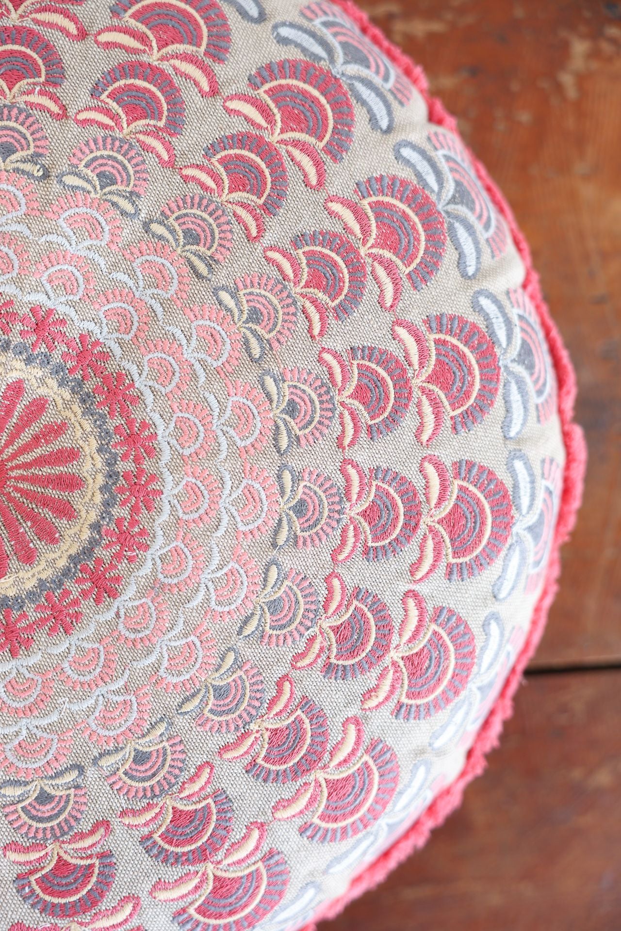 Infuse your space with soft, bohemian charm with our round cotton cushion, featuring a natural base adorned with delicate pink and purple embroidery. The intricate handcrafted design adds texture and artisanal elegance, while the soft cotton fabric ensures comfort and timeless style.