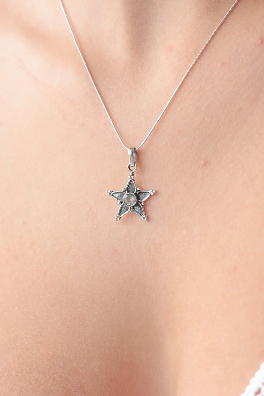A luminous blue topaz stone nestles within an oxidised star frame, casting purple starlight and celestial enchantment wherever you venture.