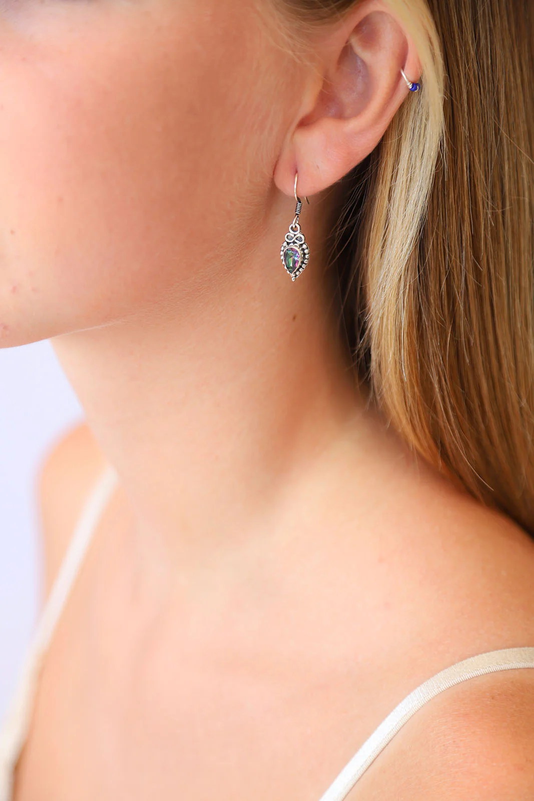 A simple teardrop earring, featuring a stunning Mystic Topaz stone. The Iola Earrings are decorated in an ornate oxidised design.