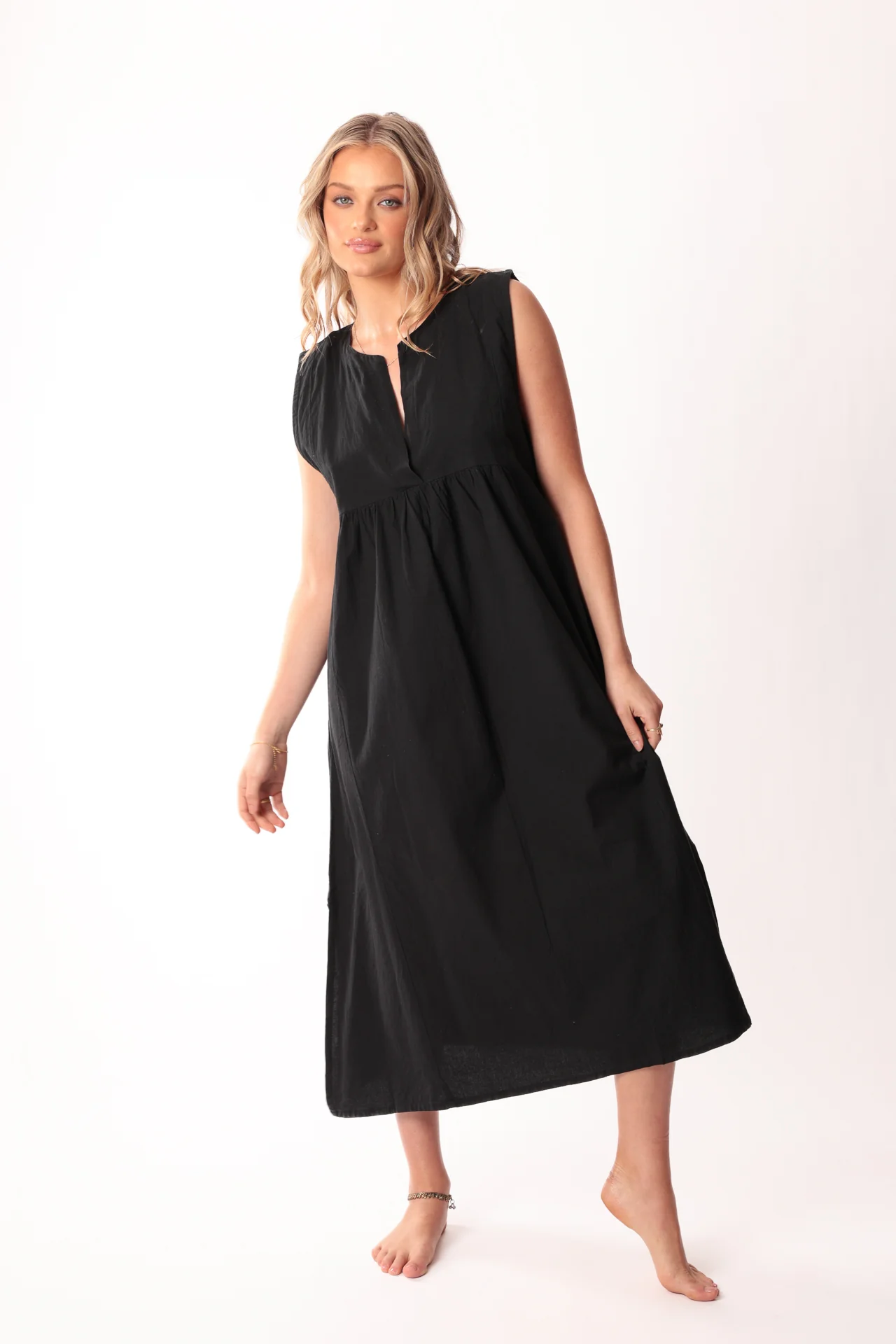 Our Khatani Dress is a sleeveless maxi dress crafted from soft black cotton. Featuring a relaxed fit and a flattering V-neckline, it drapes effortlessly for a comfortable, free-flowing silhouette. Perfect for warm days or layered looks, this versatile dress blends simplicity with timeless boho style