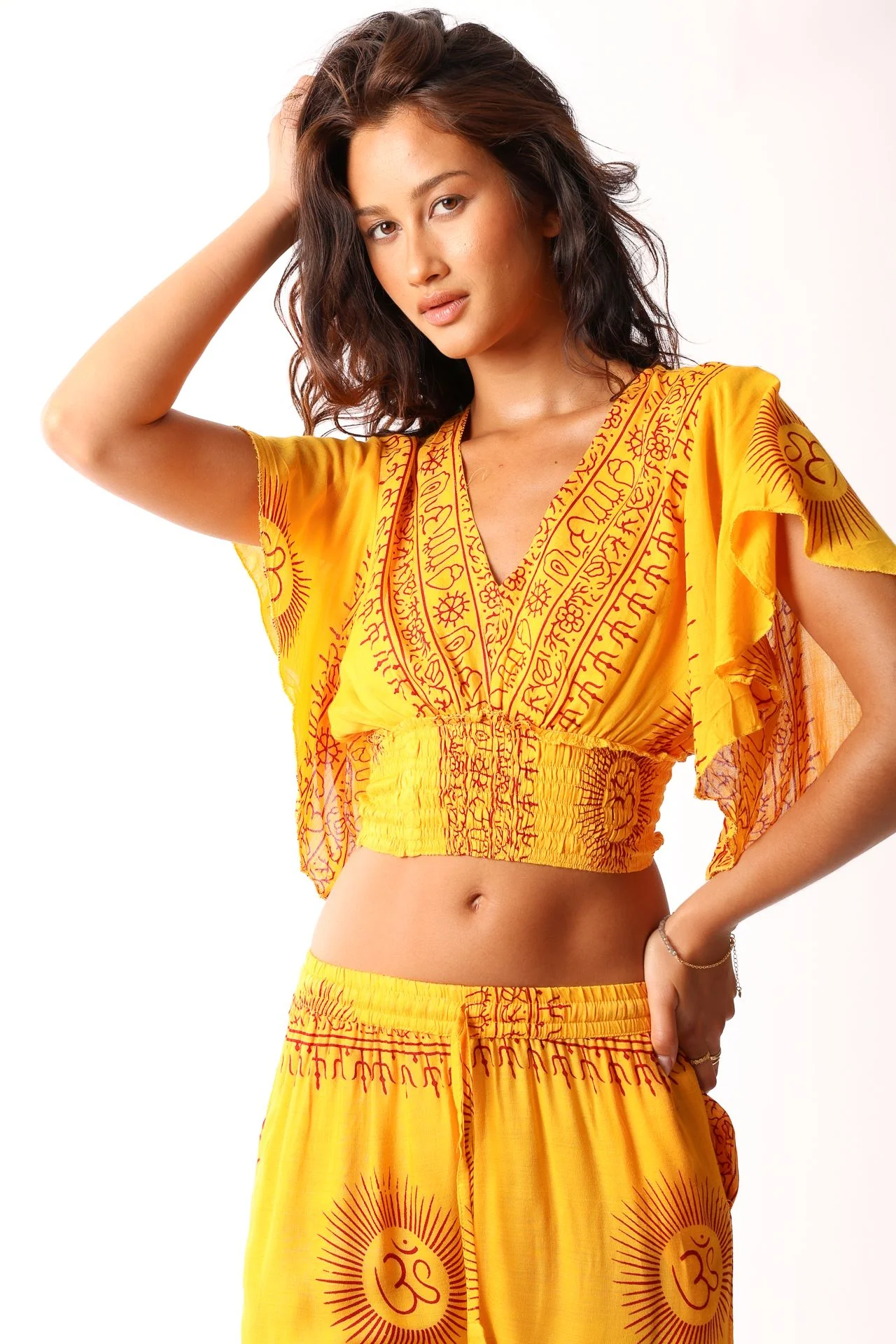Our Holi Top is a boho-inspired crop top crafted in a vibrant yellow, adorned with traditional Om symbols. Featuring a shirred elastic under bust, a flattering V-neckline, and relaxed, flowing short sleeves, it offers a comfortable, breezy fit. Lightweight and versatile, it pairs effortlessly with skirts, pants, or shorts for a free-spirited, sun-ready look.