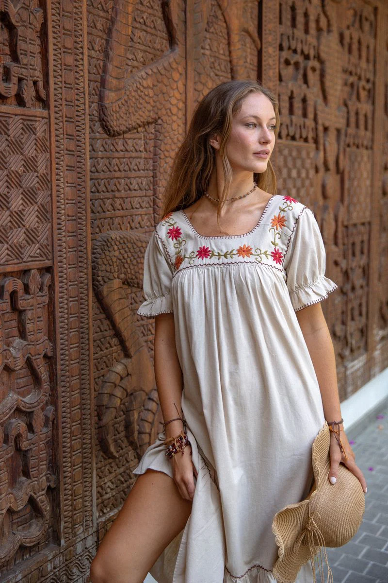 Crafted from natural cotton, our Reggie Dress features a relaxed fit with beautiful floral embroidery on the bodice for a touch of artisanal charm. Capped sleeves with elastic cuffs add a soft, feminine detail, while subtle stitching accents and a maxi length create an effortlessly timeless silhouette.