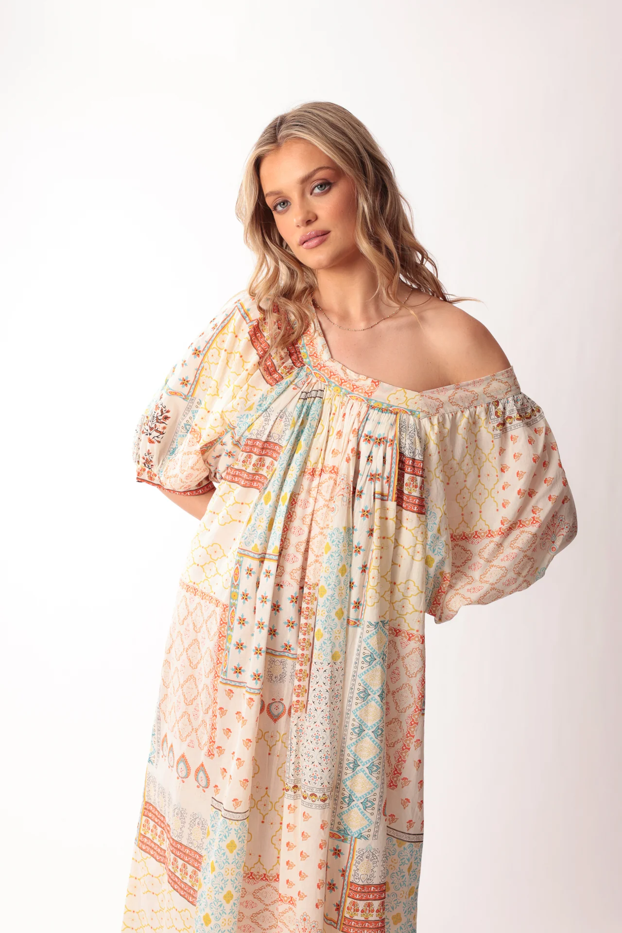Our Wayfarer Dress is a relaxed fit style crafted from patchwork inspired printed fabric on a natural base, highlighted with turquoise and orange tones. It features billowing sleeves, creating a playful and effortlessly boho look.