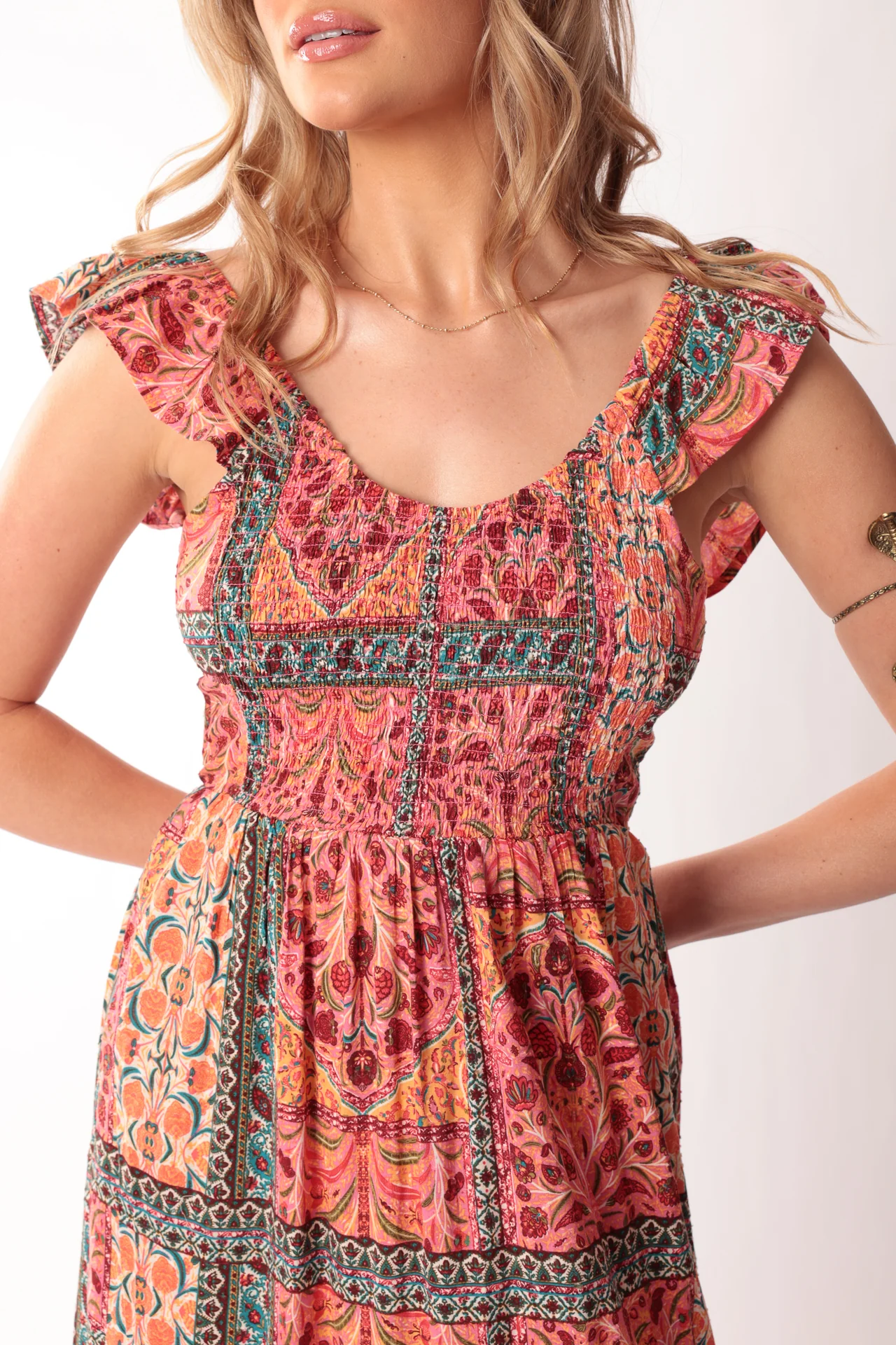 Our Margarita Dress features a shirred elastic bodice with a soft scoop neckline and gently frilled sleeves for a romantic touch. The flowing maxi skirt pairs beautifully with the adjustable tie-back detail, allowing for a customisable fit and effortless boho charm.